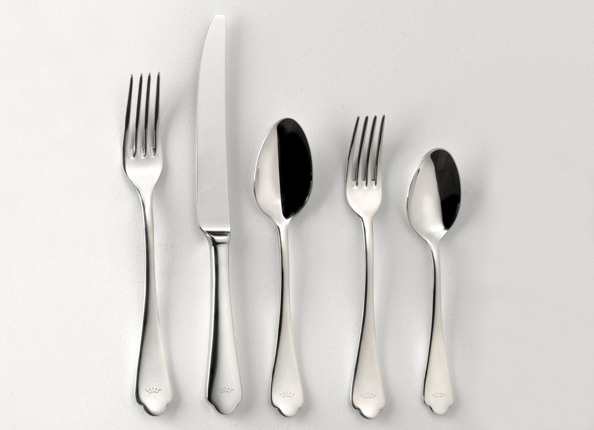 The Flora 5-piece cutlery set is indispensable for your mise en place. Functional and ergonomic, this design flatware is perfect for serving all courses from starter to dessert with ease. This 5-piece set includes a table knife and fork, a dessert spoon and fork and a coffee spoon. The high-gloss polished stainless steel cutlery set is entirely made in Italy, combining traditional know-how with the most innovative techniques, to last a lifetime. The Flora cutlery set brings a stylish tone to your table setting with its dynamic and light profile. The pleasure of its lines providing fluid movement, make this service perfect for both a refined dinner and everyday use. An essential and versatile cutlery set should never be missing from a table that wants to make a difference.