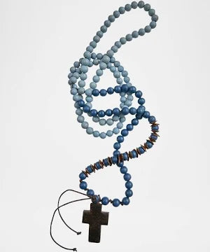 Ombre blues wooden blessing beads with natural iron seals and classic Barboglio cross