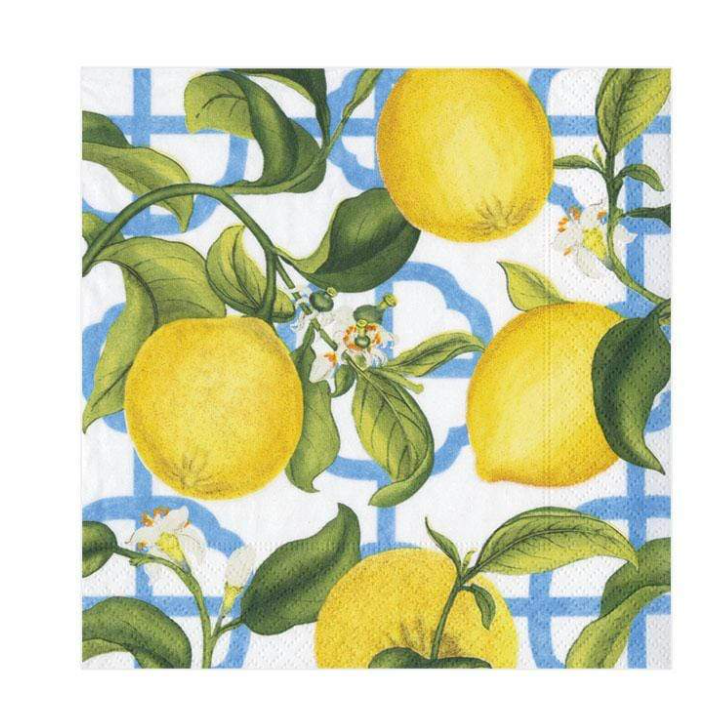 In this Design: Lush lemons and leaves cascade across a charming blue and white pattern background. The beautiful blue and lemon yellow create a cheerful palette.