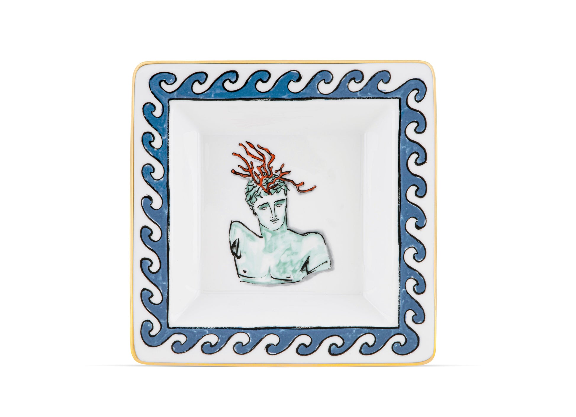 The design centers around the classical bust of a deity reminiscent of the mythical Arion, son of Neptune, adorned with a crown of red coral. A deep Grecian blue evokes ocean waves illuminated by exquisite pure gold threading, a distinctive mark of Ginori 1735. The design speaks to the mythological voyage that young designer Luke Edward Hall engenders in this bold, kaleidoscopic collection, one that transports us on a legendary journey into the depths alongside Neptune and his fellow deities. Il Viaggio di Nettuno is available in a complete assortment of tableware, tea and coffee sets, as well as original home accent pieces that bear legendary designs in the unmistakable style of Ginori 1735.