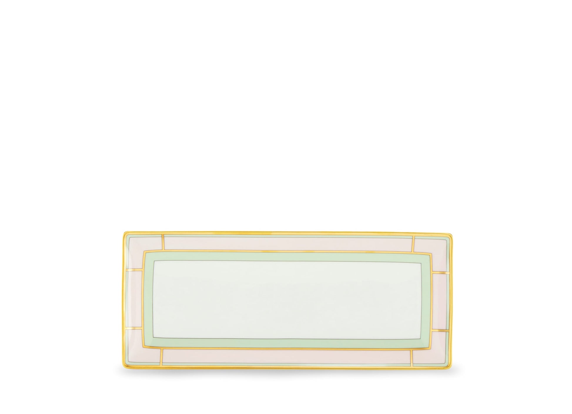 The pink and green decoration is embellished with delicate gold threading, a signature of Ginori 1735. Versatile and dynamic, it is designed to be both a home décor accessory and to complete the table service as a tray for serving delectable hors d'oeuvres or micro-desserts. It comes wrapped in an exclusive luxury box that makes it a perfect gift. Sophisticated. Feminine. Vivacious. Elegant. Diva brings together the allure of a bygone era and a contemporary, modern design that celebrates the enduring glamour of the great movie divas. It is available in four pastel colors to be mixed & matched in unique and unpredictable arrangements.