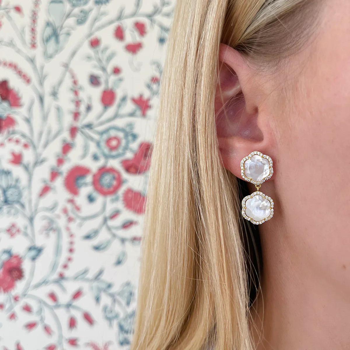 14k gold dipped Clementine drop earring with faceted mother of pearl and pave CZ border.