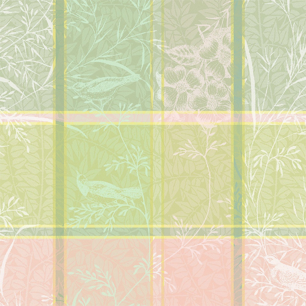 Blooms in pastel hues of green and pink create joyous bird and flower imagery.