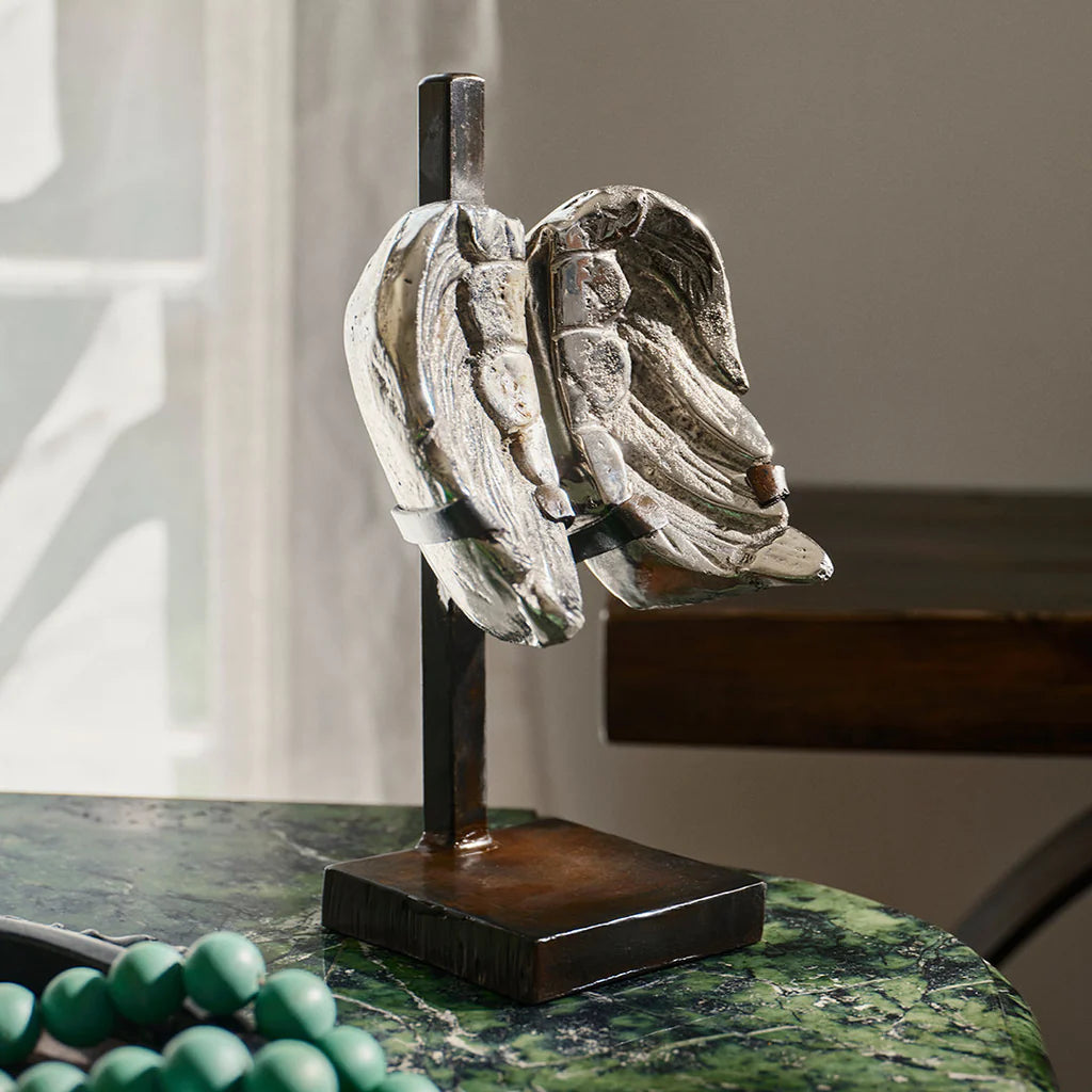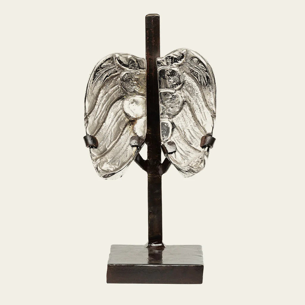 Heavy wax cast nickel wings on iron stand. Sculptural and sturdy