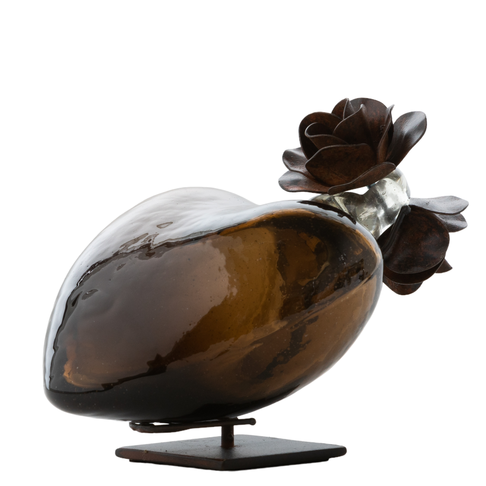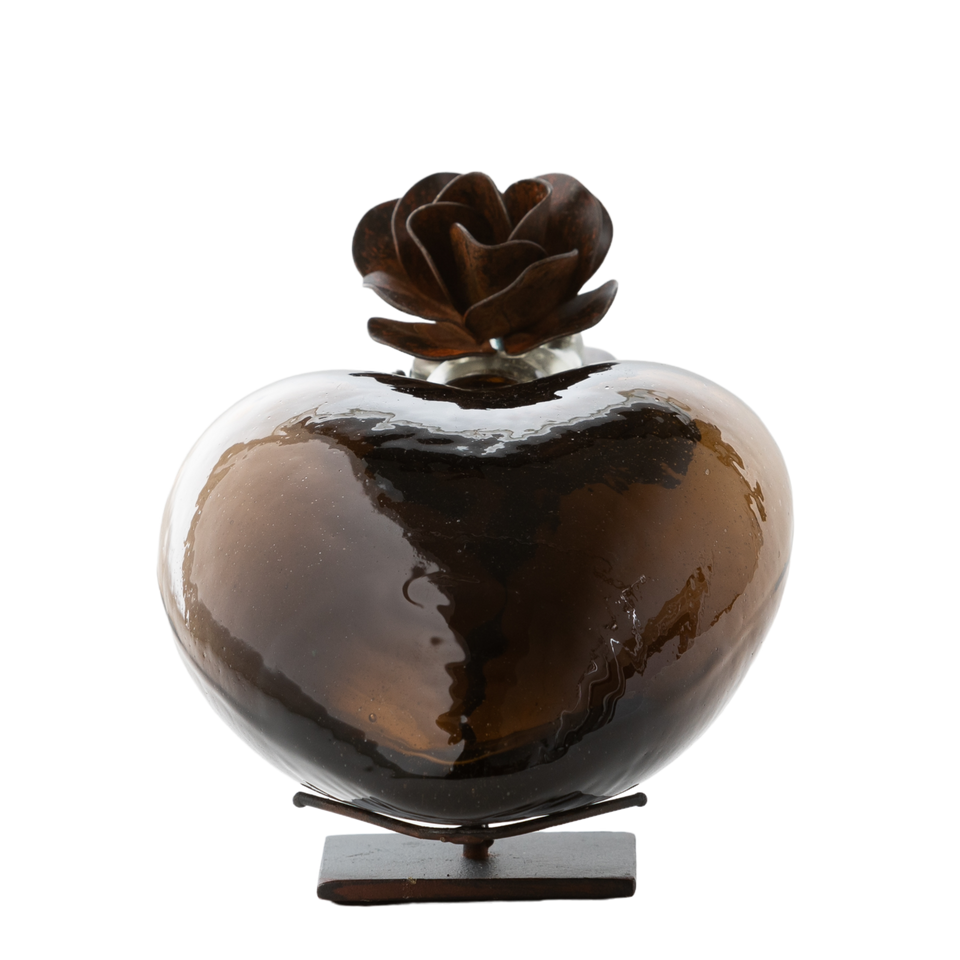 Mouth blown sumptuous chocolate glass heart with an iron rose . . . add to a place setting for a dinner for two . . . a symbol of the sweetness of love . . .