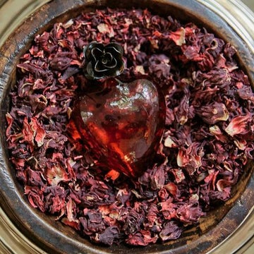 Mouthblown glass heart the color of passion . . . finished with a perfectly crafted iron rose