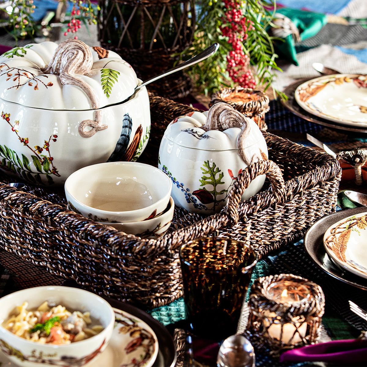 - Lidded pumpkin crafted of ceramic and stoneware in a forest walk motif with a curling stem on top
