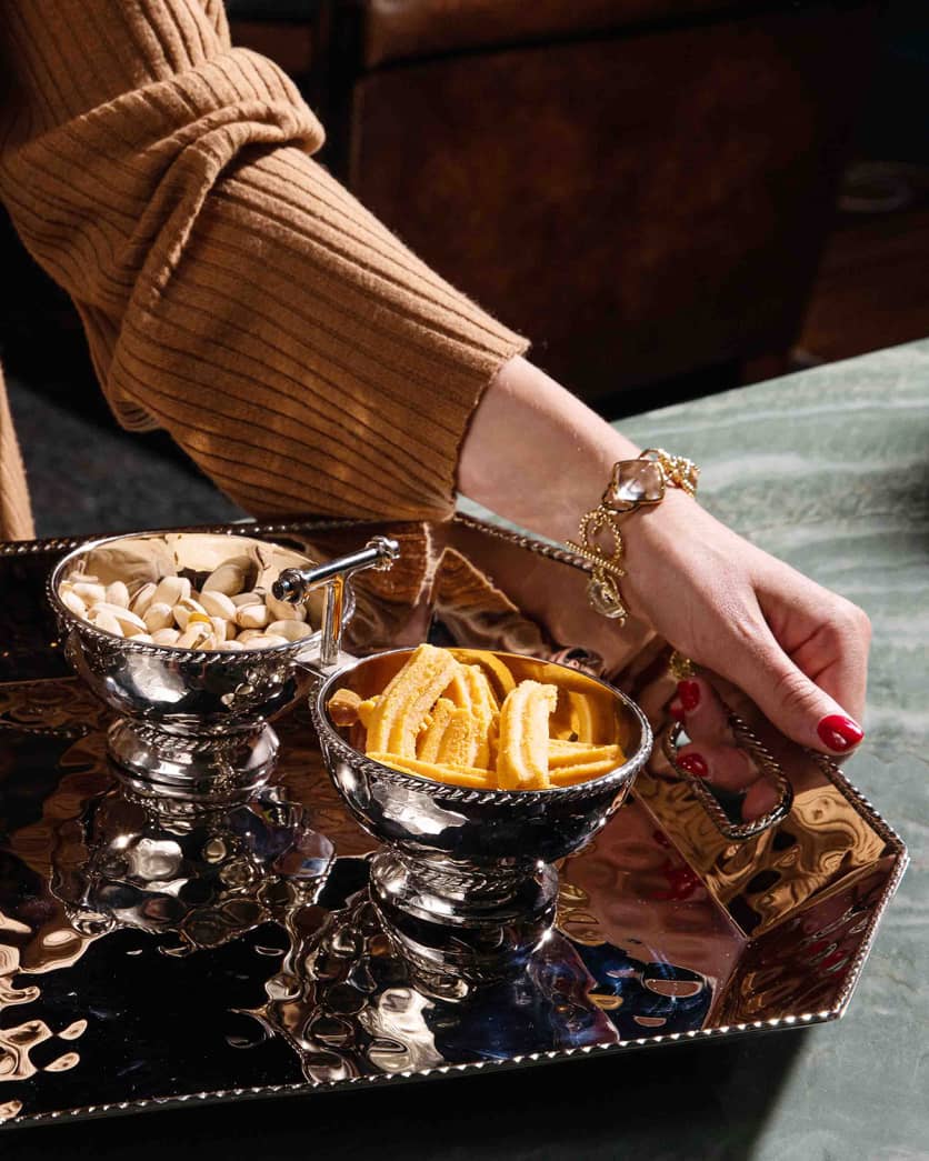 This spectacular tray is ideal to set atop an oversized ottoman or coffee table to display books, glassware or decorative objects -- or as a stunning way to serve party drinks (cue the drama and glamor!). The tray includes sloping sides and two handles for easy carrying. Decorated with a tidy trimming of simple thread, each piece in our Graham barware collection is handmade in hammered stainless steel and polished to brilliance.