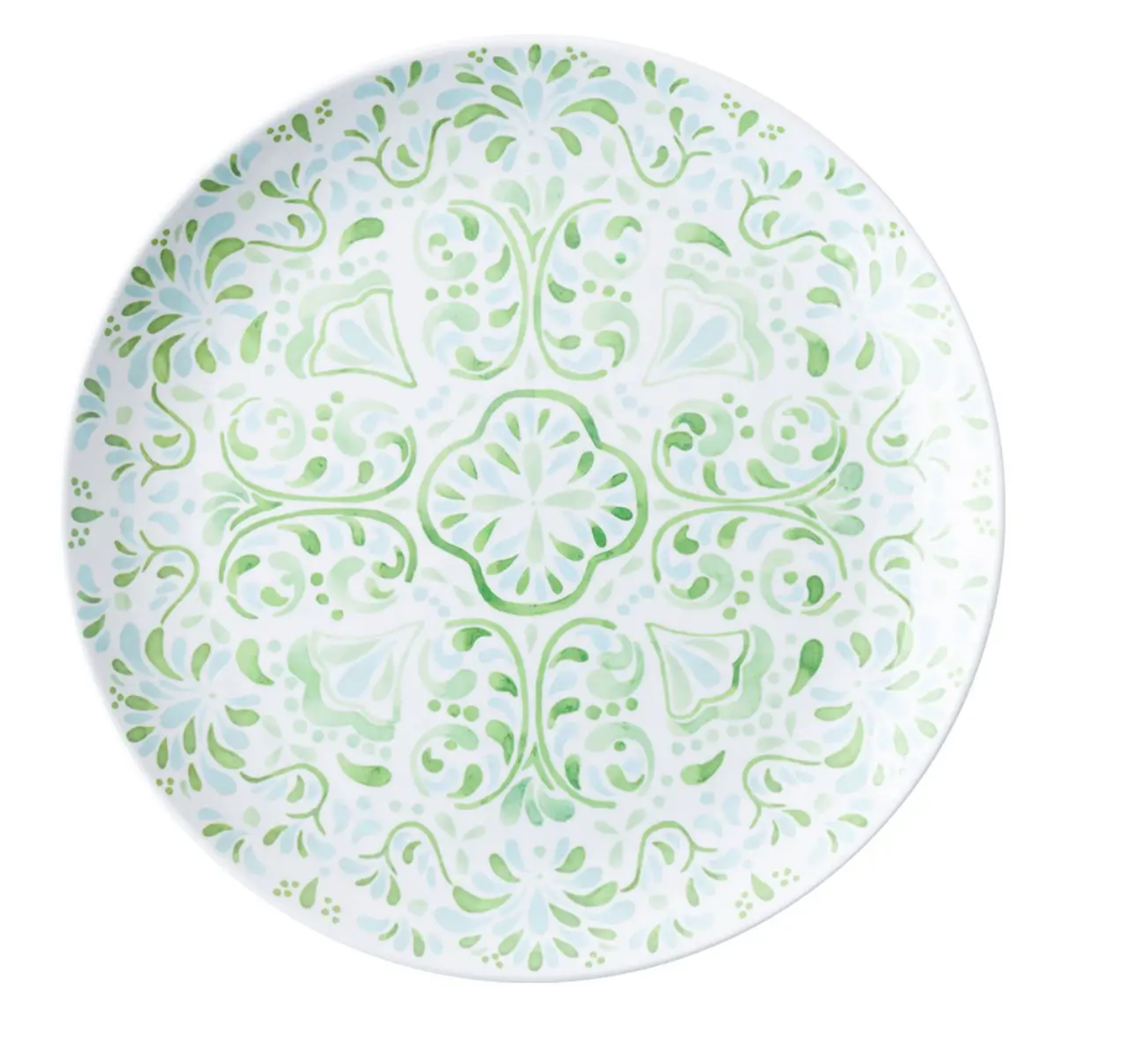 The beguiling pattern of this dinner plate was inspired by the intricately painted tiles we found on an escapade to the Iberian Coast. Made of sturdy melamine and featuring a verdant palette of soft sage and sky blue hues that are both refreshing and soothing - you will want to use this gorgeous green plate everywhere, indoors and out.