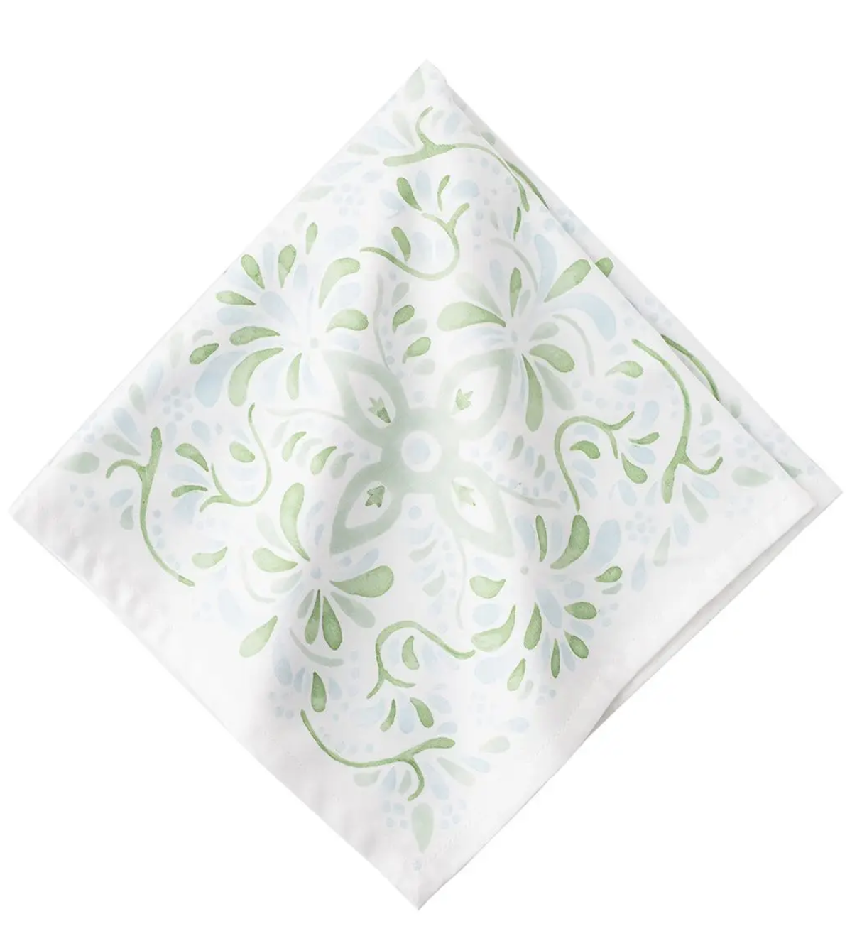 Inspired by the intricately painted tiles we found on an escapade to the Iberian Coast and featuring a palette of soft sage and sky-blue hues, this napkin will be a welcome addition to any tablescape.