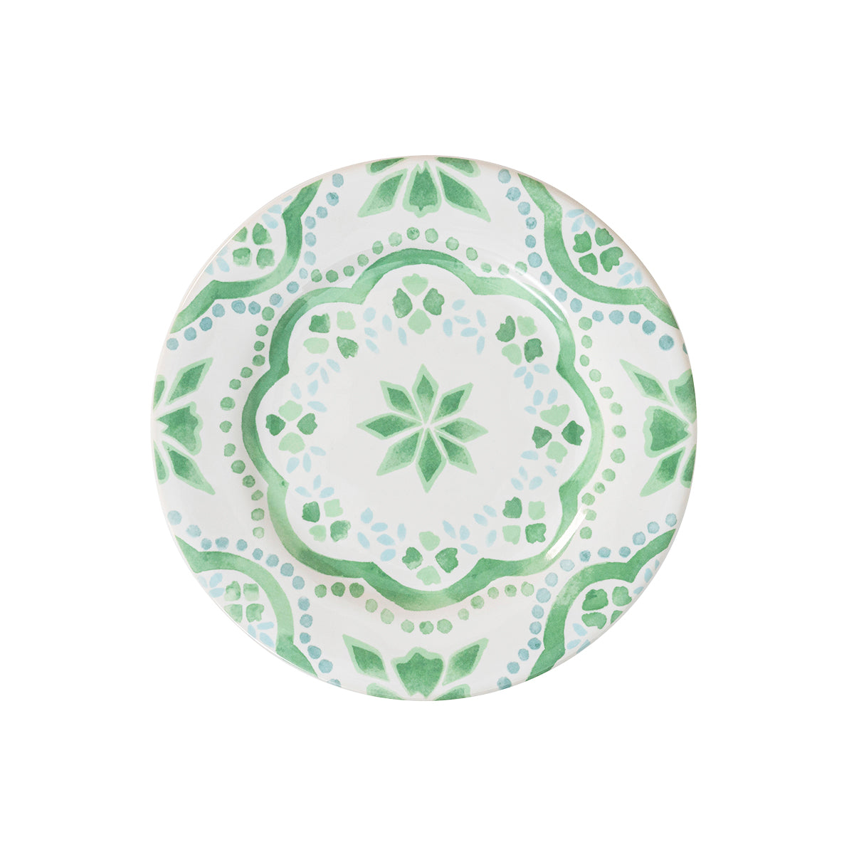 The beguiling pattern of this side/cocktail plate was inspired by the intricately painted tiles we found on an escapade to the Iberian Coast and makes an eye-catching accent piece for tablesettings. Featuring a verdant palette of soft sage and sky-blue hues that are both refreshing and soothing - you will want to use this gorgeous green plate for serving appetizers, tapas, and sides.