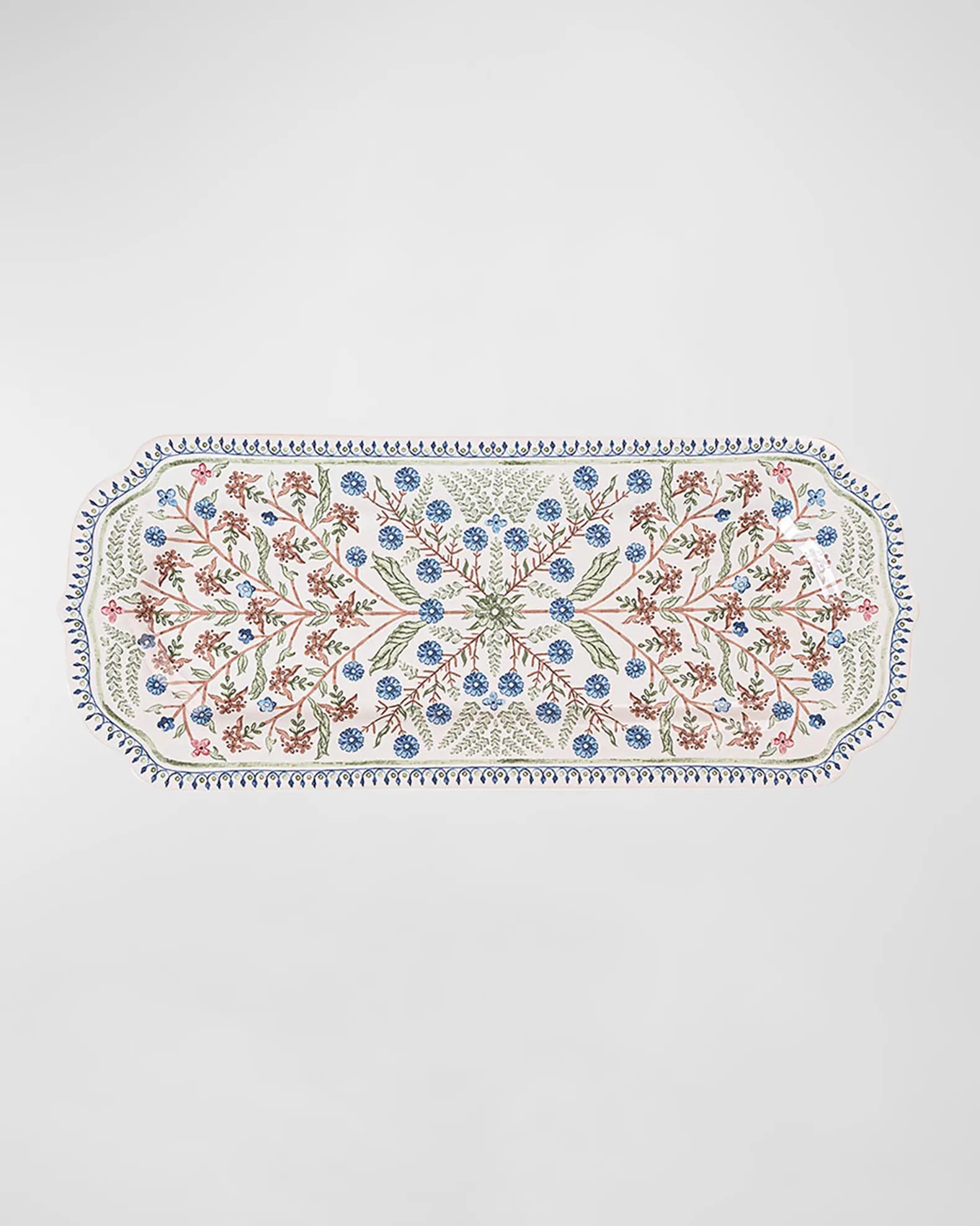 Festooned with a burst of intricate leaves, charming blue flowers and a scalloped rim with tiny dots and pink blossoms, this enchanting plate makes serving up salads and sweets a delicious work of art.