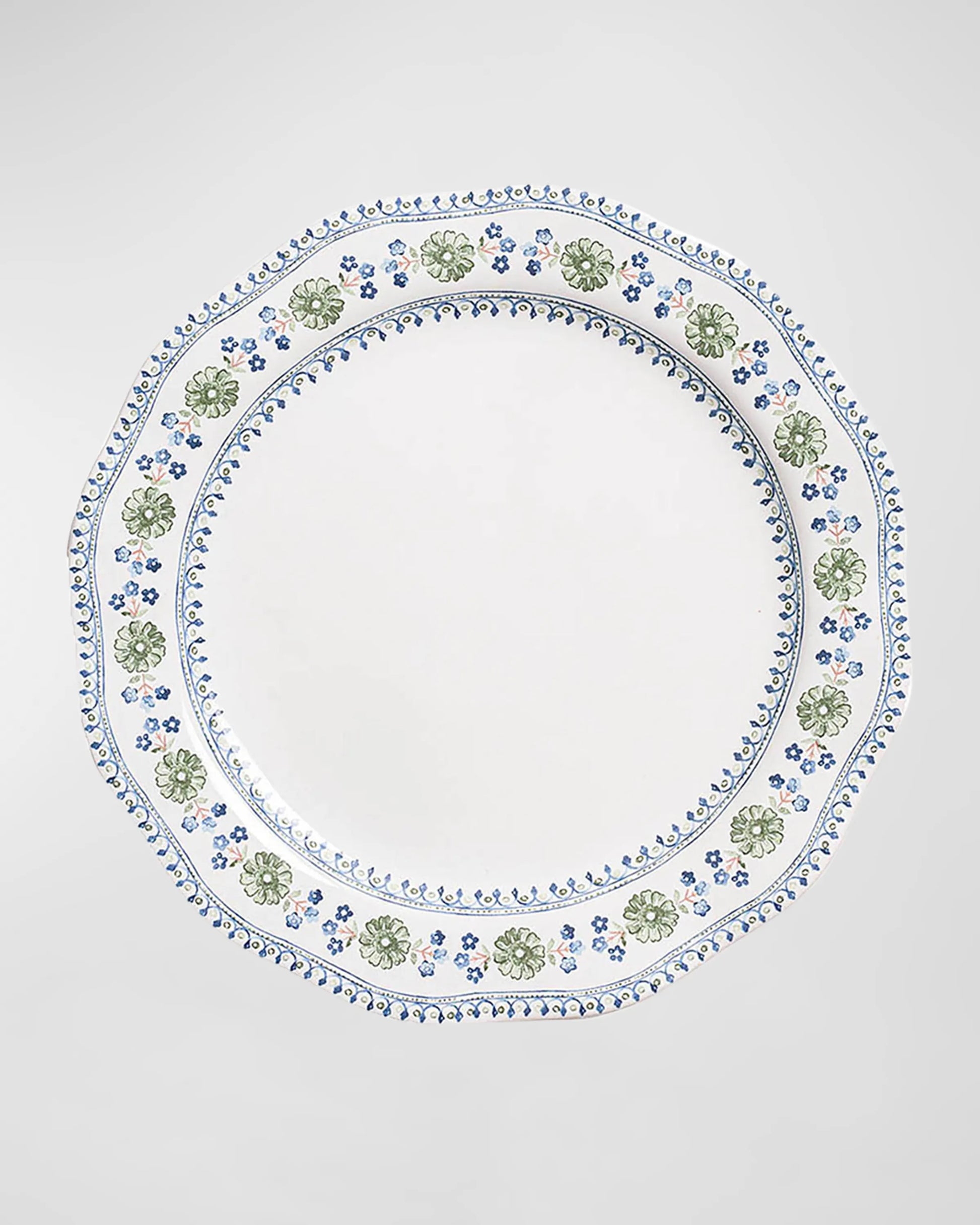 With our heads in the clouds and our feet on the cobblestone streets of ancient Seville, we dreamt up this intricate floral motif that reimagines the romantic city's hand-painted tiles and patterns, rendered in the organic colors of the Spanish countryside. Equal parts fresh, tranquil, and whimsical, the scalloped rim of this dinner plate is perfect for framing culinary creations and adding a lovely layer to place settings for mixing and matching.