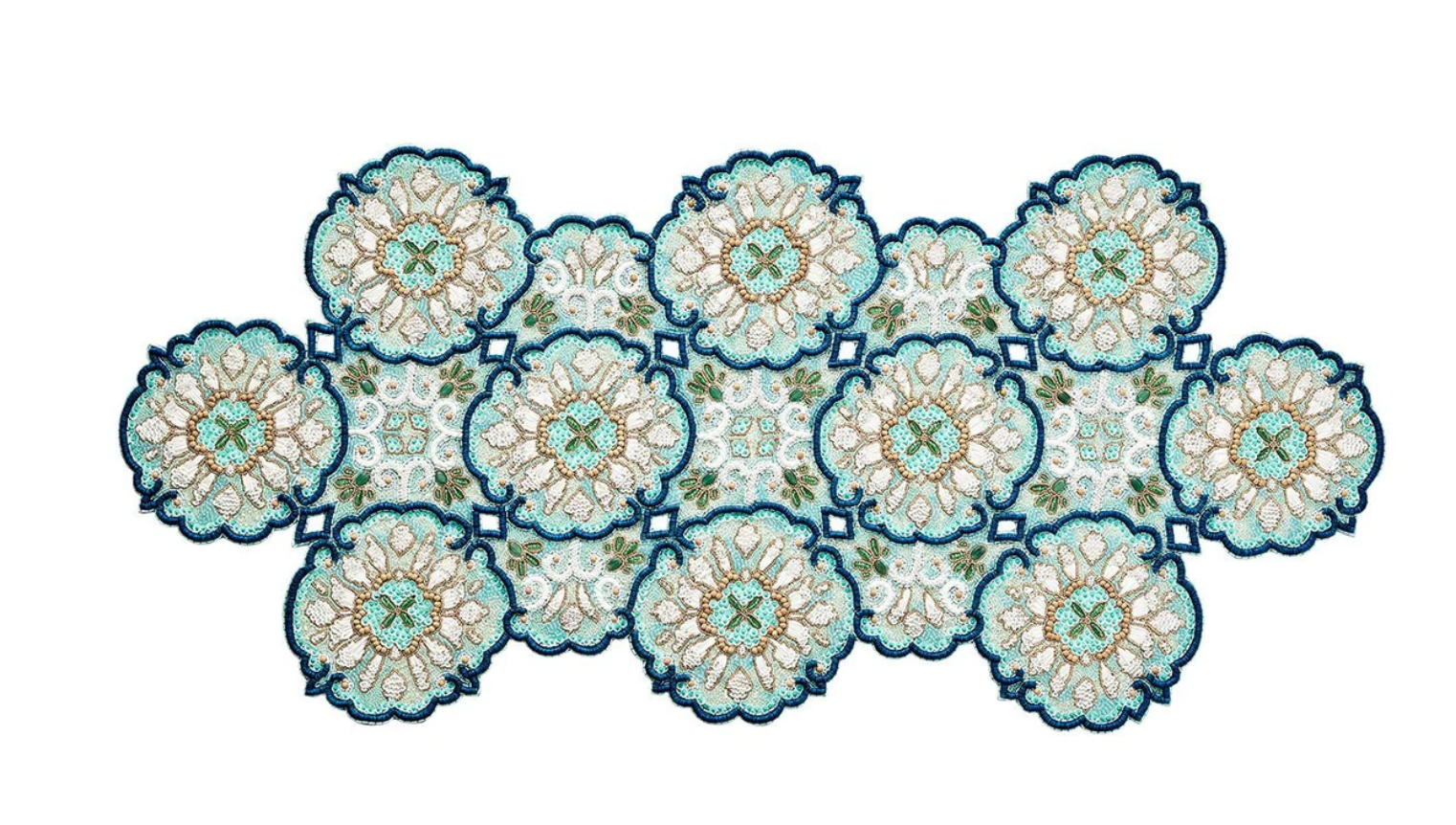The hand-beaded Lisbon Runner is inspired by azulejos, glazed blue ceramic tiles that decorate the streets of Portugal's capital. Beads are hand applied to the Lisbon Runner using intricate techniques mimicking the traditional watercolor-like tiles.