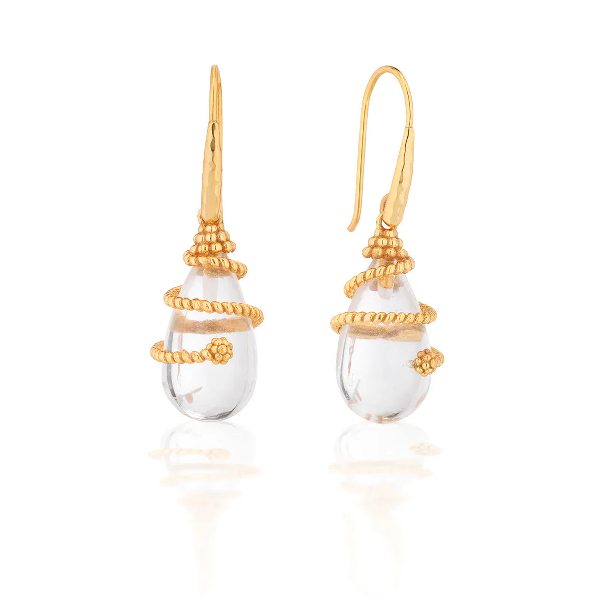 Like a drop of sparkling dew that nourishes everything it touches, even the smallest act of kindness has immeasurable ripple effects. Equal parts elegant and bohemian, these luscious drops of natural clear quartz make a subtle statement with whatever you pair them with. Embellished with a dancing swirl of twisting gold tread, these versatile statement earrings will be your go-to’s for day to night, weekday to weekend styling.