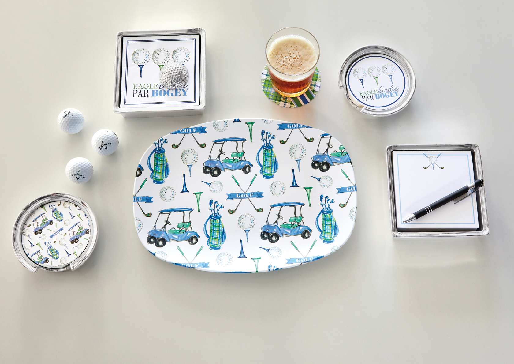 The classic design of our Golf Ball Signature Napkin Box and a gleaming Golf Ball Napkin Weight, sandcast in 100% recycled aluminum, rests on a stack of colorful Tee Time cocktail napkins.