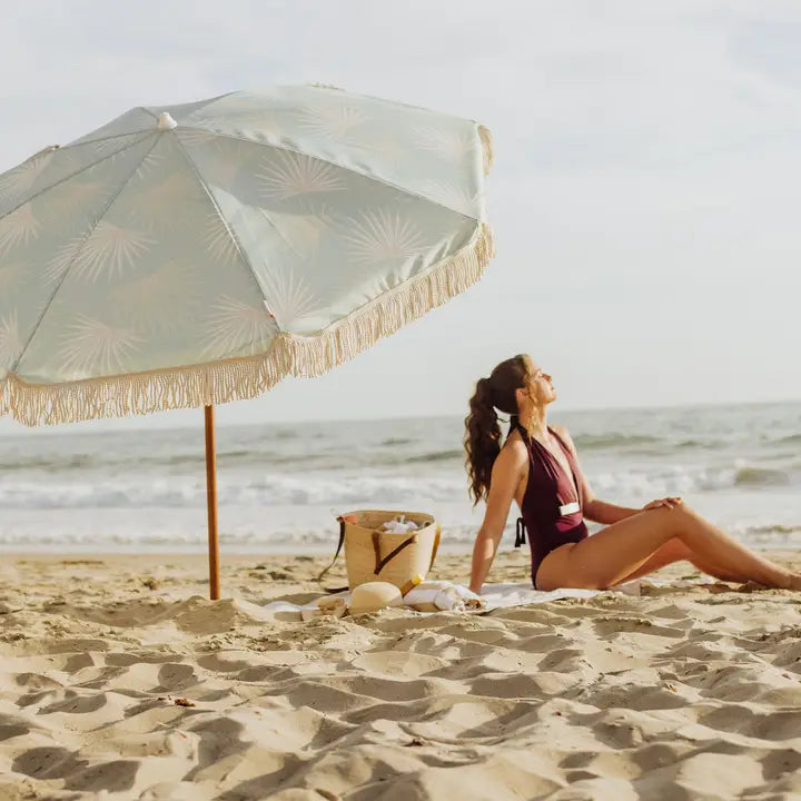 Relaxed yet refined elegance defines your Beach State of Mind - and that’s why the Palm Beach Summerland Beach Umbrella is the only sun shade that meets your exacting standards. In refreshing green with an iconic palm print and fanciful fringe, this small sun umbrella packs a huge style punch. Your beachside lounges, poolside hangs, and patio parties just got even more chic. The Item Dimensions Open: L: 74.4 x W: 74.4 x H: 82.56 (weight: 9.5 lbs)