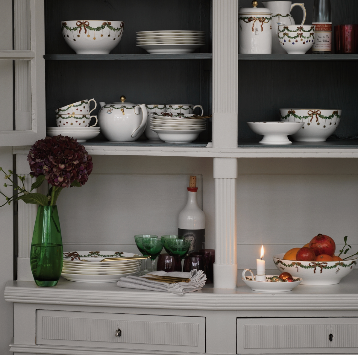 The beloved Christmas dinner service from Royal Copenhagen comes to life every Christmas and has become a part of many holiday traditions. The festive wreaths of spruce bordering the plates, bowls and cups are adorned with silk ribbon bows and Christmas decorations, creating a rich and elegant service, which is the perfect background for all your joyful holiday meals.