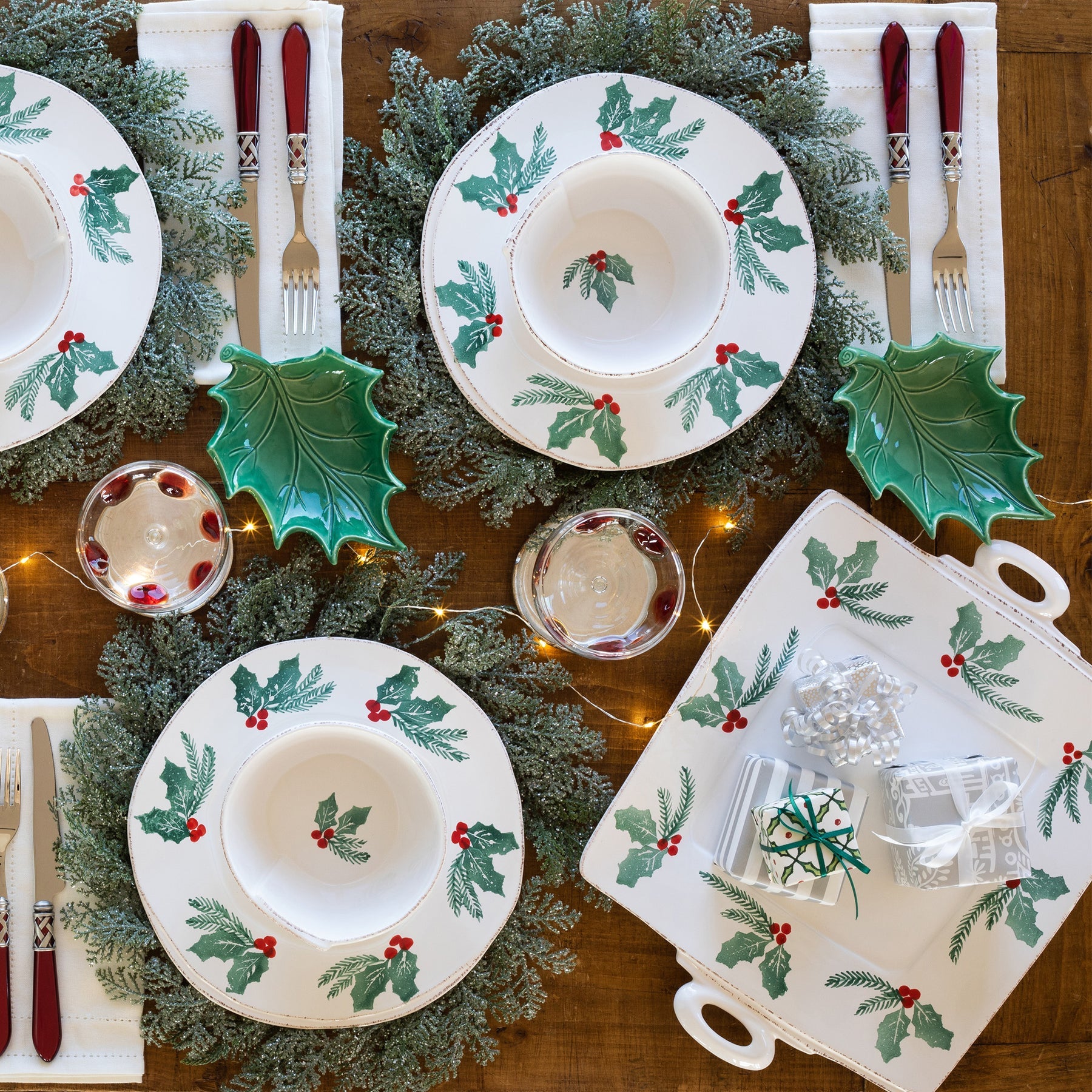 The Lastra Evergreen Handled Square Platter features handpainted greenery and holly berries on a rich white background. The classic holiday color palette feels fresh on the rustic, handformed shapes, and the collection is at once elegant, artistic, and joyous.