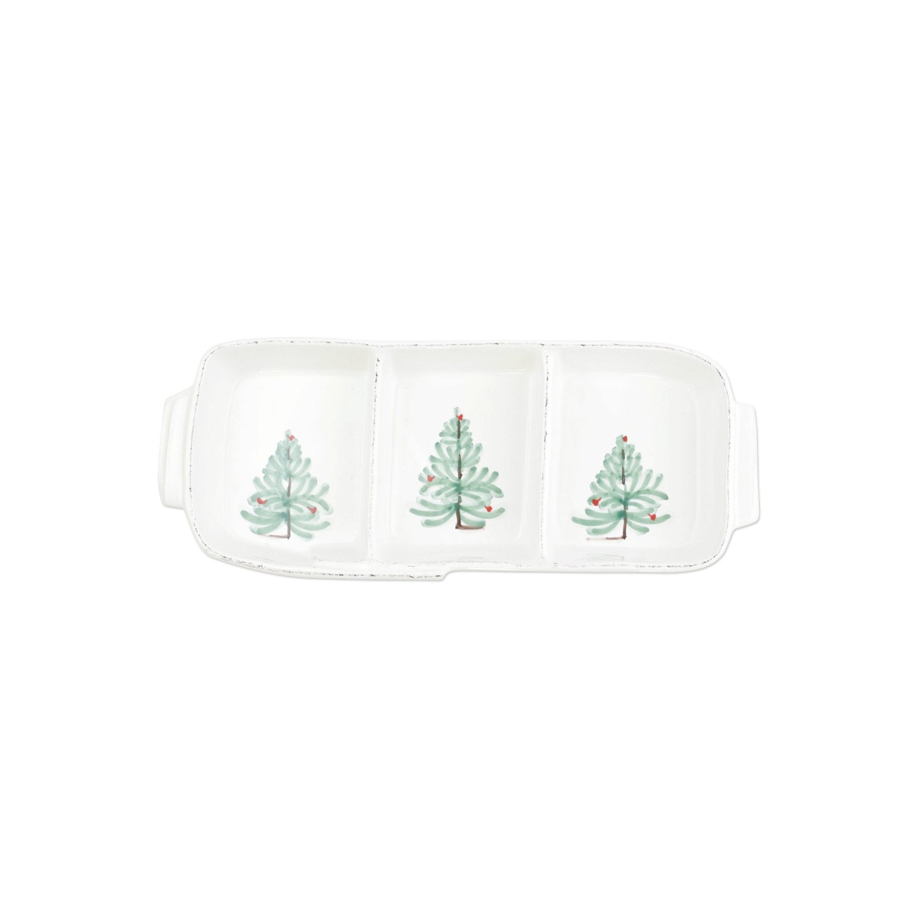 Delight in the holiday magic as handpainted fir trees and bright cardinals drift across the fresh white canvas of the Lastra Holiday Small Three-Part Server. Mix and match with Lastra for a fun and sophisticated holiday table with a twist!