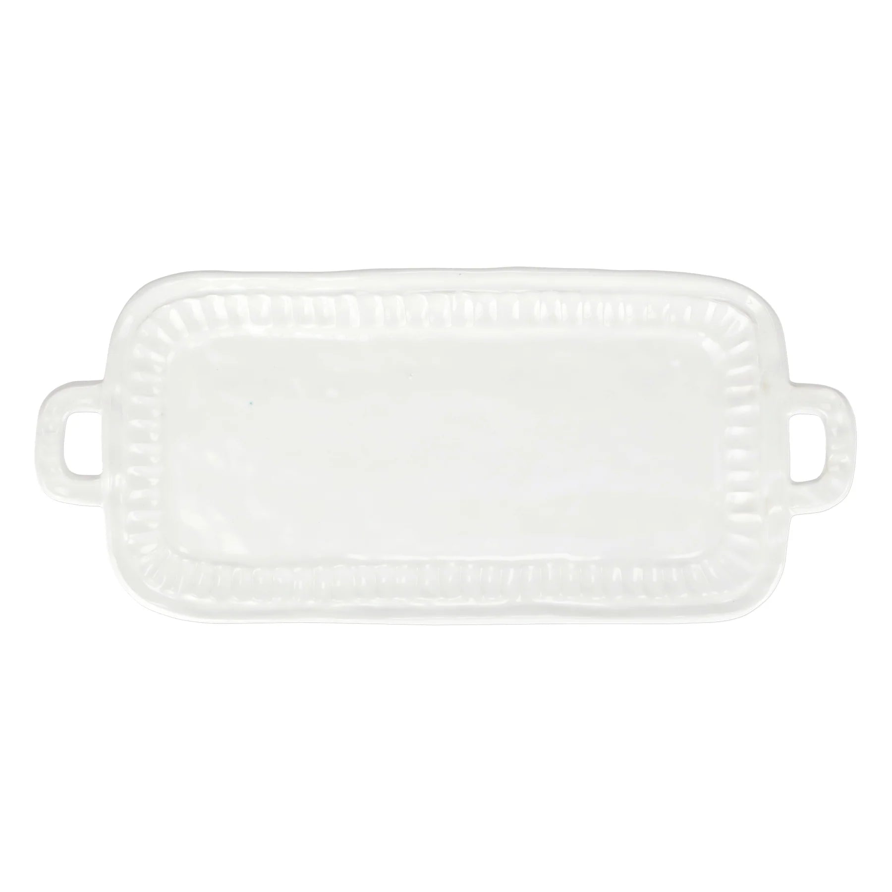 Pietra Serena, meaning serene stone, represents the simplistic beauty of the handpressed design found on the Pietra Serena Handled Rectangular Platter.